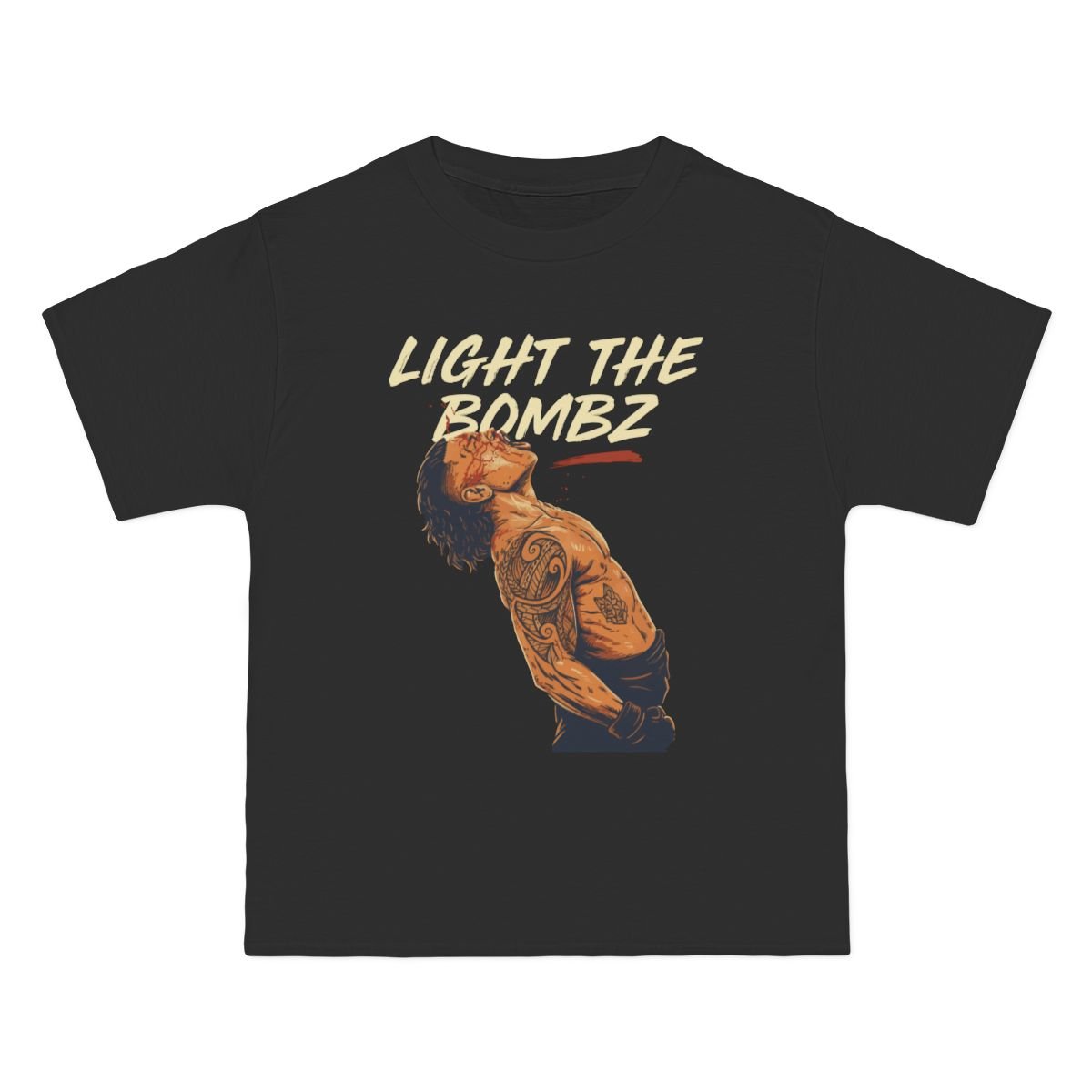 This relaxed-fit tee carries a vintage punk energy — a gritty, tattooed figure mid-motion with bold lettering above that reads “LIGHT THE BOMBZ.” The soft, midweight cotton feels broken-in from the first wear, and the lay-flat collar and taped shoulders keep the shirt looking sharp through repeated washes. Wear it to shows, skateparks, late-night drives, or when you want an extra edge on an ordinary day. It sits naturally in the wardrobe of someone who values attitude, authenticity, and a lived-in look.