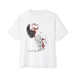 This oversized boxy tee blends artful edge with everyday ease. The front features a hand-drawn, slightly surreal portrait with delicate linework and splashes of deep red, giving the shirt an intimate, slightly rebellious mood. Wear it loose over jeans, layered with a leather jacket, or as a soft canvas for your favorite pins and patches. The relaxed silhouette and dropped shoulders create a casual, confident look that moves with you — from late-night gallery hangs to slow weekend coffee runs. The lightweight-but-substantial fabric drapes beautifully and holds printed detail well, so the illustration remains striking wash after wash. It feels lived-in from the start: comfortable, expressive, and quietly bold.